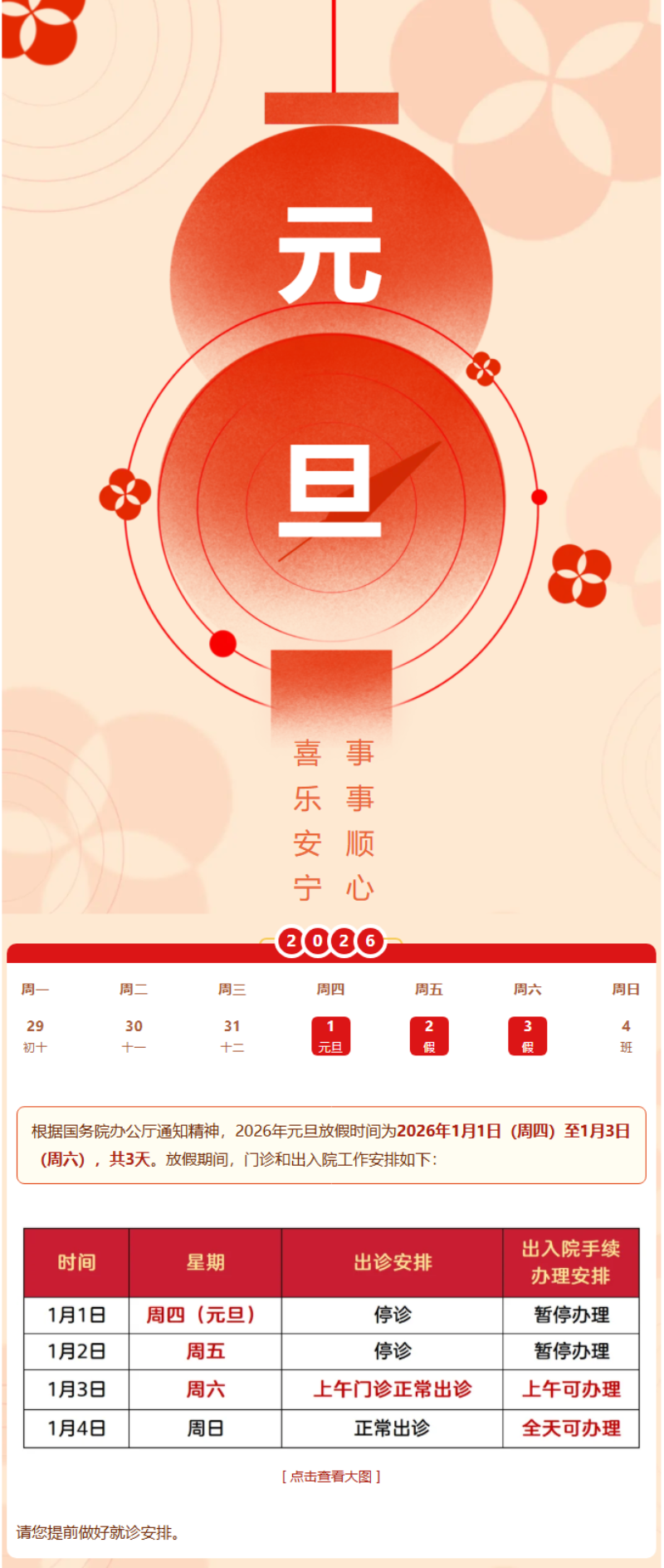 我院元旦假日期间门诊及出入院工作安排