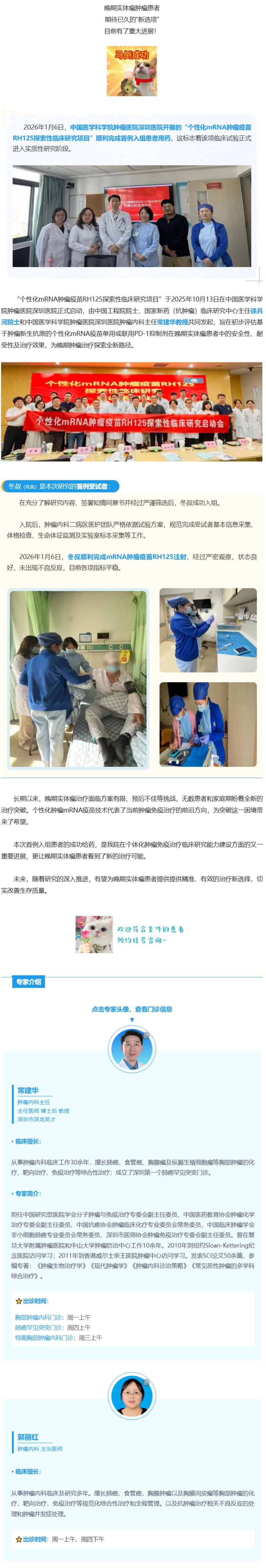 晚期实体瘤患者治疗新曙光!我院mRNA肿瘤疫苗临床研究首例入组患者顺利用药