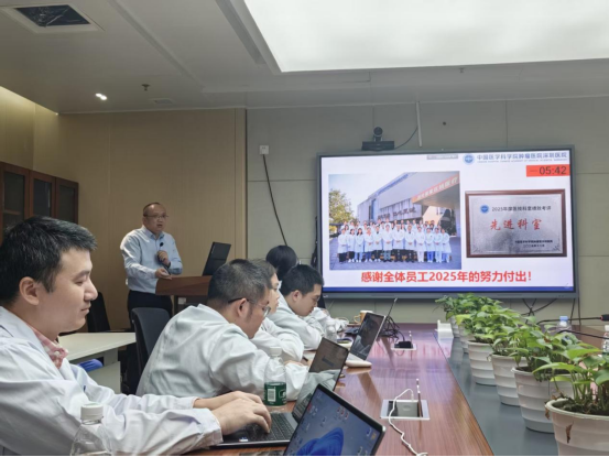 科室主任林勇平汇报2025年工作总结及2026年工作计划。在医院党委的有力领导下,检验输血科以“精准检验支撑肿瘤防治”为使命,在结果互认全面推进、检验收费政策调整、试剂耗材集采深入实施及DRG/DIP支付改革等多重考验下,业务量增长4.52%。科研成果丰硕,依托“三名工程”英国伦敦大学学院Tariq Enver教授癌症精准医学研究团队项目,在研项目(含IIT项目)共计17项,发表论文22篇,其中SCI论文13篇,多名青年成员在高水平学术会议上崭露头角。人才梯队建设与高层次人才引育方面成效显著,3人通过高级职称评审;学科具备培养本科、硕士、博士各层次学生的资格和条件(新录取硕士、博士研究生,及博士后各1人),为学科可持续发展奠定了坚实基础。凭借综合实力,科室获评医院绩效考核年度“先进科室”。2026年,科室将以建设区域领先的临床检验与实验平台为愿景,深化学科建设与临床研究转化,为临床诊疗与患者健康提供更精准、高效、优质的检验服务。