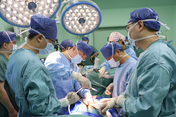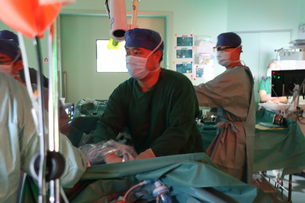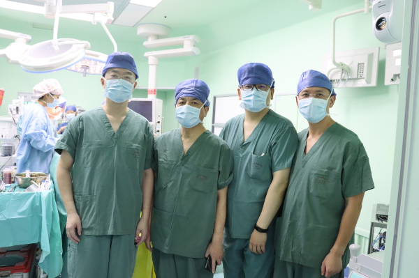 黄璋侃主治医师(右一)在为患者实施肝癌根治性手术