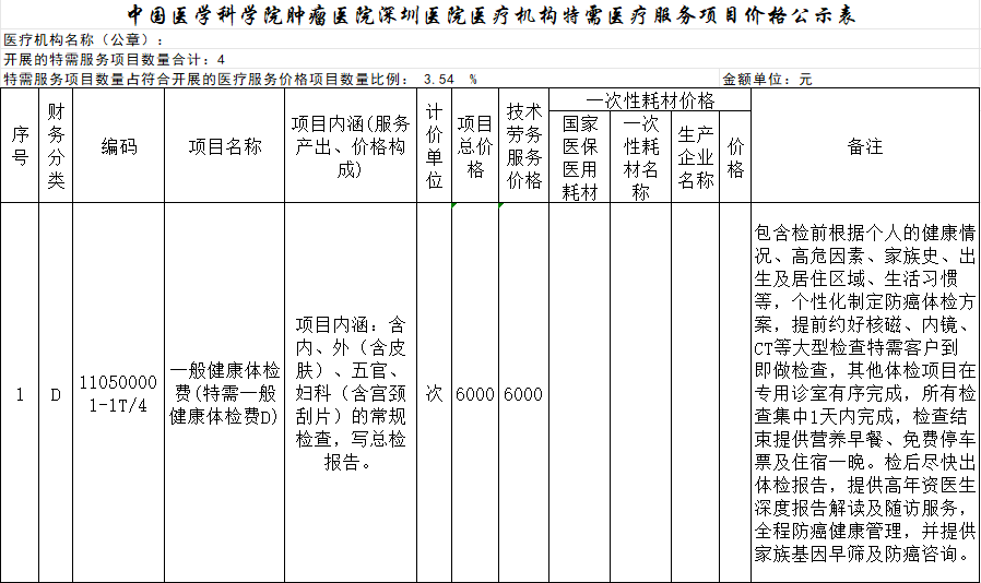 中国医学科学院肿瘤医院深圳医院医疗机构特需医疗服务项目价格公示